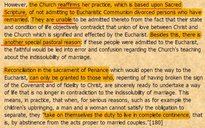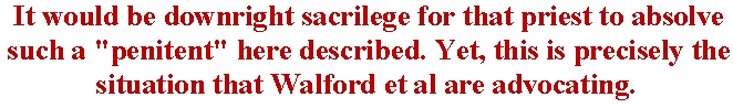 Likewise, if one is in fact committing objective acts of adultery, and there is no hope that these acts are anything but actually adulterous, and if this person is absolutely without any intent or desire whatsoever to try to be rid of these sinful acts, then it is absolutely, categorically, metaphysically impossible to efficaciously absolve this “penitent” and licitly give him or her Communion. And this is precisely what Walford et al are advocating for by their rejection of Familiaris Consortio paragraph 84 and the Catechism of the Catholic Church paragraph 1650.
