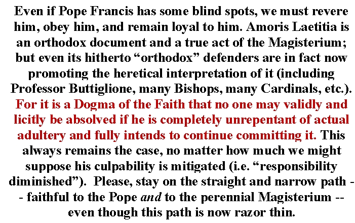 Perhaps above all, we must remember that the promoters of the heretical interpretation deliberately ignore this one most poignant thing: namely, what has not happened. They rejoice every time a new document or phone call is leaked, or interview granted, indicating the Pope himself may have the heretical interpretation in mind as his own preference (which does not make it the Magisterium), and they certainly rejoice every time a new Bishop’s conference institutes the heretical interpretation. But they ignore the fact that the Pope has now had almost two years to actually Magisterially teach the heretical interpretation: and he has not once done so. With the flick of a wrist he could do so, and he has not. It takes a great ignorance — likely a willful one — for that to not speak volumes.