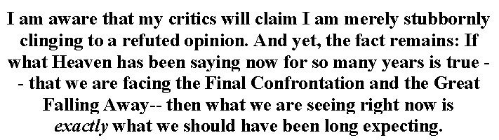 I have had this blog for almost a decade; and most of that time I have spent imploring my readers to recognize that, for so many years, Our Lady has been warning us, in so many apparitions, that the Great Apostasy is coming. In many ways, it has been here for several decades. But it is clearly about to climax. And yet, the promises of Christ are irrevocable: the gates of hell will never prevail against the Church.