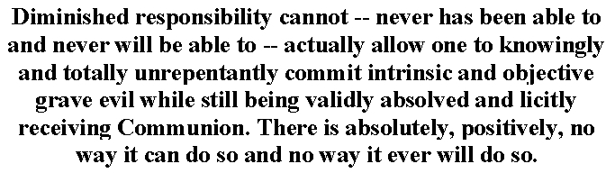 If “diminished responsibility” all of a sudden becomes legitimate grounds for valid Absolution and admission to holy Communion, even when the sin in question is entirely grave and entirely without any form of repentance or desire to stop, then anything goes. The “slippery slope” argument is not being employed here; that is not necessarily a logically valid argument; for it states that movement in one direction necessarily means its continuation. But the reductio ad absurdum is a valid argument; and this is the one used here. In other words, if a given justification is required to grant a certain conclusion, then that conclusion cannot be admitted without also admitting whatever other conclusions that justification necessarily leads to. This, again, is basic logic that even a youth should be capable of.