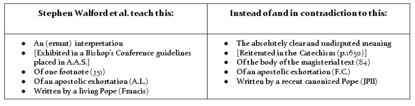 Tied for first place in what we must above all remember in this great trial is, again, a very simple fact that Walford et al deliberately ignore. Amoris Laetitia is an Apostolic Exhortation; a Magisterial document of identical weight to Familiaris Consortio, the act of the Magisterium by which Pope St. John Paul II taught, definitively, the very opposite of Walford’s teaching. The absence of even the most basic reason here is mind boggling. Walford et al. is readily contradicting the clear and explicit teaching contained in the body of an Apostolic Exhortation written by a canonized saint Pope just a short few decades ago for the sake of an ambiguous and incorrect interpretation of a footnote at the bottom of an Apostolic Exhortation written by the living Pope. My 3 year old son has a long way to go before he reaches the age of reason; but even he knows that a scale with a brick on the right side will not be budged by a feather being placed on the other.