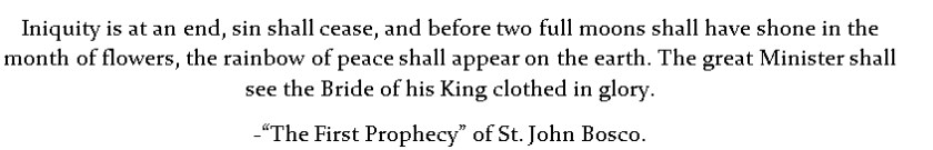 So much for the Era of Peace being the heresy of “Millenarianism”! John Bosco makes clear that indeed, on the earth, iniquity shall end, sin shall cease, and the Church (the “Bride”) shall be clothed in glory. This is, in other words, the Triumph of the Immaculate Heart of Mary.