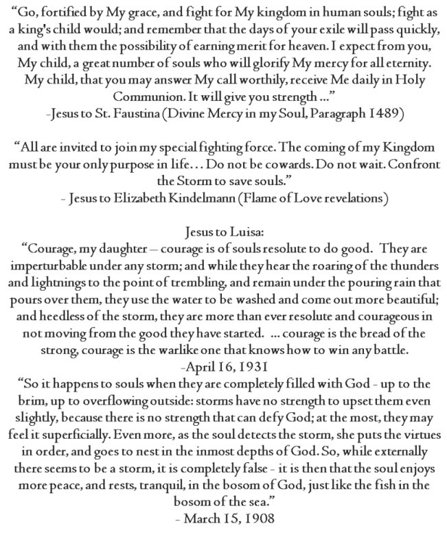 Pray for me, my dear brethren in Christ, and be assured of my prayers for you! I know that so many of you are being likewise attacked in various ways — even if not publicly, at least by circumstances, by relatives, friends, and coworkers, and last but not least by the Devil himself. As Padre Pio said, it is only the Devil’s silence and complacency with what we are doing that should trouble us. The Time of Peace is coming, but it is not here yet. More trials await us, and now is the time for battle. Put on the full armor of God and proceed with courage. Your reward will be great in Heaven, wherein the worst sufferings of this world will seem like nothing compared to the glory to be revealed. Let each trial you must suffer only redouble your resolve to more boldly than ever Proclaim God’s Mercy and God’s Will while there is still time left in the Time of Mercy, which is quickly drawing to a close.
