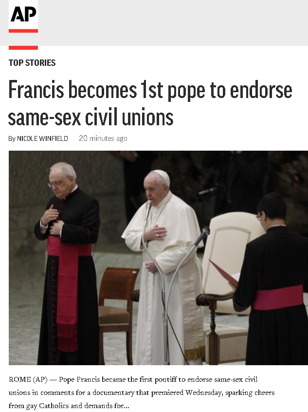 If we ever needed a reminder that the prophecies here quoted will indeed be fulfilled, we were given that reminder today; the very day after Pedro Regis’ message above. Pope Francis just endorsed legal same-sex unions (i.e. “gay civil unions”).