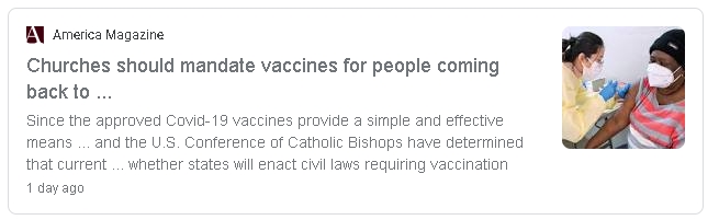 Just yesterday, as the Jesuit above was interviewing Fauci, America Magazine published an article insisting that vaccinations must be made mandatory for Catholics to return to Mass. Yes, you read that right. This “Catholic” publication is demanding that assisting at the Holy Sacrifice of the Mass, which is the source and summit of our lives as Catholics, be subjected to one’s willingness to receive an abortion-tainted vaccine for a disease with a survival rate much higher than the seasonal flu – a vaccine which will not even prevent infection or transmission, but which is only expected to reduce symptoms. (They care not that the Vatican itself – cf. §5 — has insisted that vaccination must be voluntary.) This “Catholic” publication has the audacity to claim that failing to so mandate would be “morally irresponsible.”