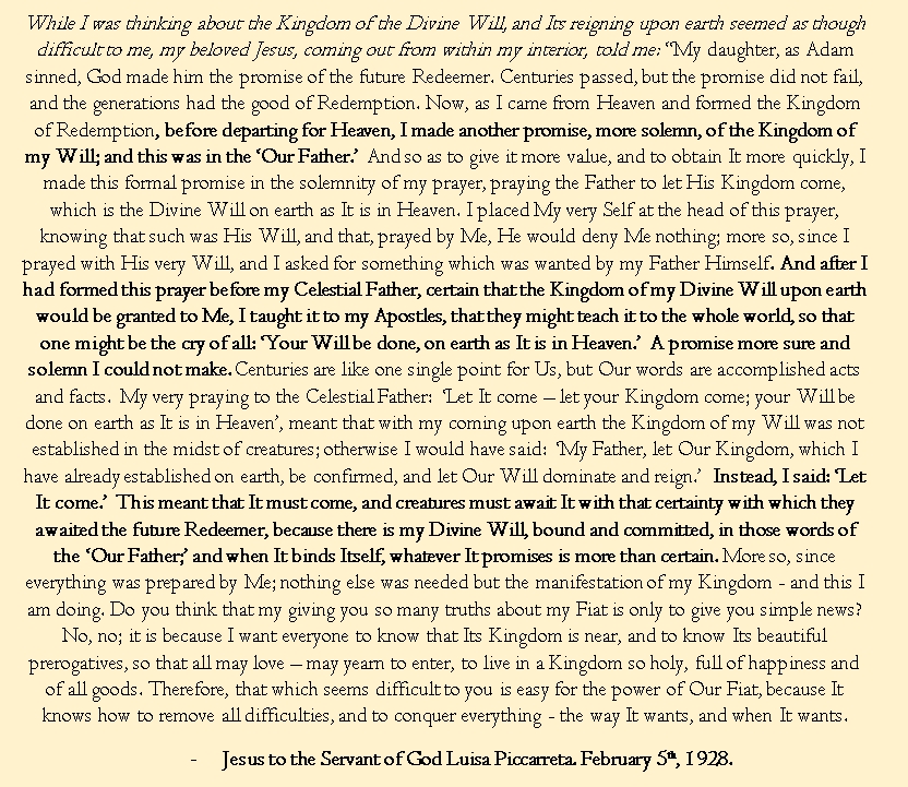 Jesus’ clearest promise in the whole Gospel, however, is found in the climax of the one and only prayer He taught: the Our Father. It is His promise that the Will of God shall reign on earth as in Heaven. Just as He meant exactly what He said when He promised He would “rise from the dead,” so too He meant exactly what He said when he prayed, prophesied, promised, and commanded us to pray: