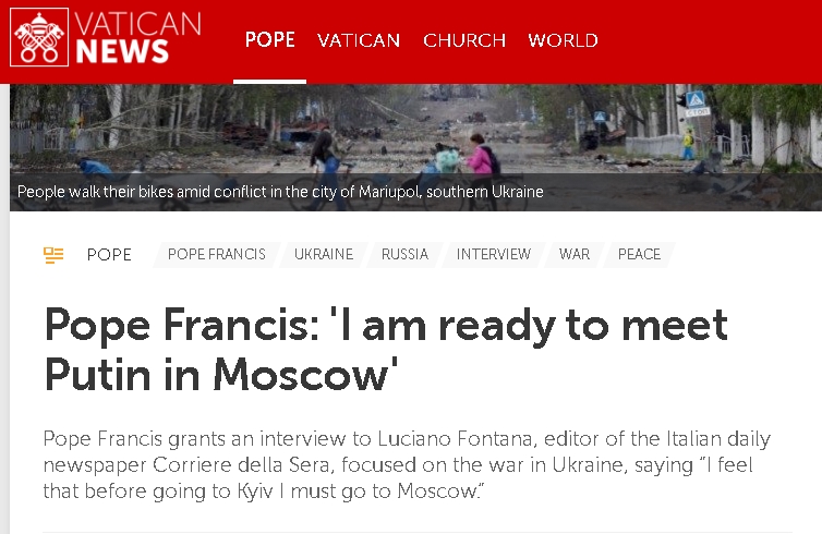 On the Heaven’s Messages/ Prophecy side of things, matters are no less extraordinary. Just today, seemingly out of nowhere — precisely when it seemed all hope was lost for a Papal Moscow Trip due to the chaos of the Russia/Ukraine war– Pope Francis said “I am ready to meet Putin in Moscow“