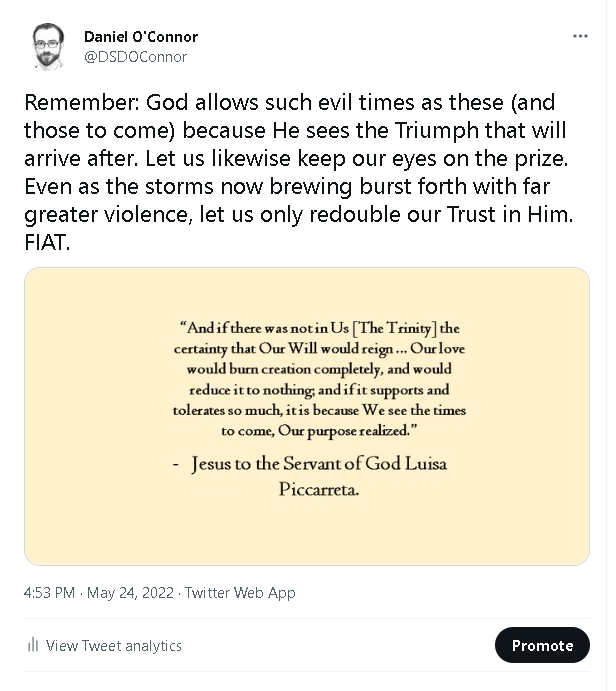In the afternoon of May 24th, I suddenly felt an urge to draw attention to the following words of Jesus to Luisa. This passage is one of a number from her revelations that I find constantly coming back to my mind; namely, Our Lord’s assurance that He tolerates such evil in these times only because He sees the far surpassing glory of what is soon to come to earth. I often take great consolation in that passage, but before that day I had never really gone out of my way to draw special attention to it. Here is what I posted to Twitter: