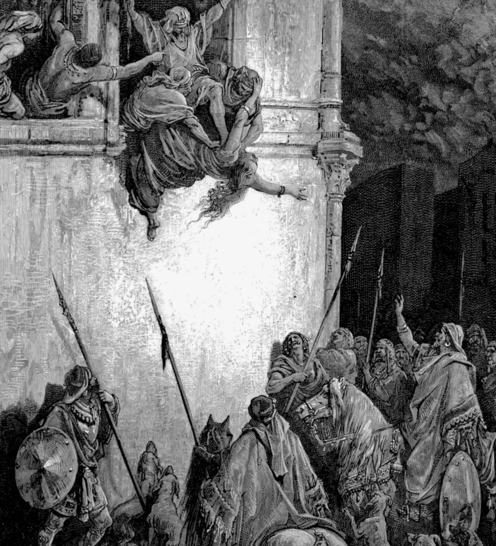 Some time after she had Naboth murdered (so that her husband Ahab could claim Naboth’s vineyard), Elisha—who had received the prophetic commission from the unmatched Elijah—sent Jehu to command the Israelite army and execute Divine vengeance upon Jezebel. When Jezebel heard news of his imminent arrival, she adorned herself with makeup (2 Kings 9:30) in hopes of seducing Jehu from her high balcony. This attempt failed, and upon arriving, Jehu called out from the ground below: