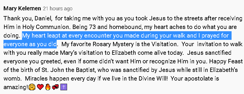 I’ve been doing these walks for over 8 years (I started DWMoM itself in 2015, but started the forerunner apostolate in 2014), and it only just occurred to me to give livestreaming one walk a try. My reason for doing so was simply to show an example of what a DWMoM walk can look like, so as to clear up any mystery and illustrate just how easy it is. But a comment someone made on the YouTube video (thanks, Mary!) got me thinking: there is another, perhaps more important thing the livestream did. It enabled those who were watching, live, to pray for all those I came across just as I was doing.