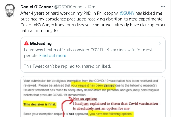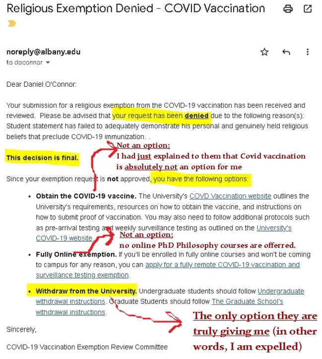 After 4 years of hard work on my PhD in Philosophy at the State University of New York in Albany, the administration has unceremoniously kicked me out since I refused to receive an abortion tainted experimental mRNA injection for a disease I already have (far superior) natural immunity to—by denying my request for a religious exemption.