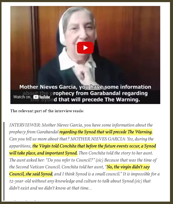 Along with the situation regarding Russia, World War III, and the use of Nuclear Weapons, the current “Synod on Synodality” is among the clearest signs of the imminence of the Warning. As I’ve posted before: