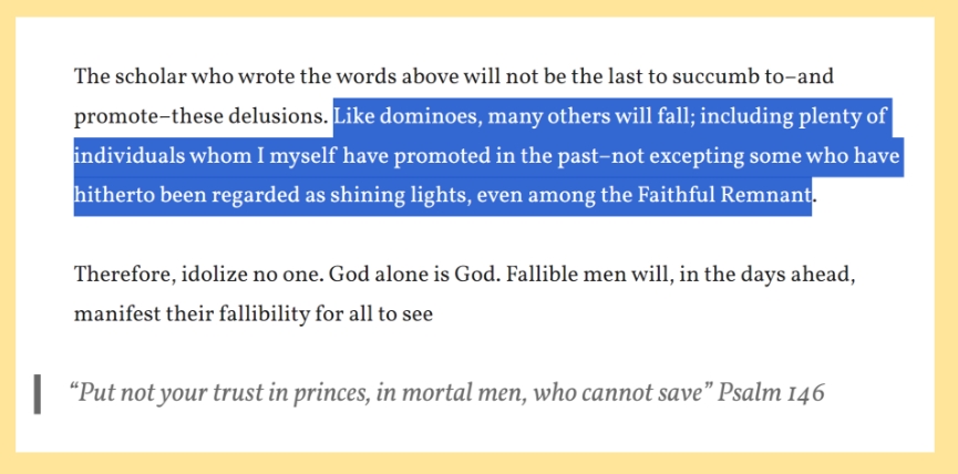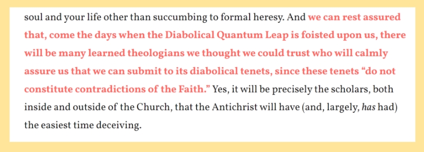 As you will see in Part Four of the book, a number of Catholic priest/ theologian/ exorcist/ authentic-private-revelation-promoters have already, in recent decades, succumbed to preaching blatant doctrines of demons as they have dropped, like flies, in capitulation to the ET/UFO Deception (always, of course, laced with assurances that this is NOT what they are doing; as they all shout “the Devil isn’t behind every rock! Don’t be a fundamentalist! I know what I’m talking about! Look at how learned I am!”) That same trend will continue, so do not be shocked when it does. Stay the course. Jesus will never fail you—and He infallibly speaks through Scripture, Sacred Tradition, and Magisterium. But men you thought you could trust will indeed fail you.