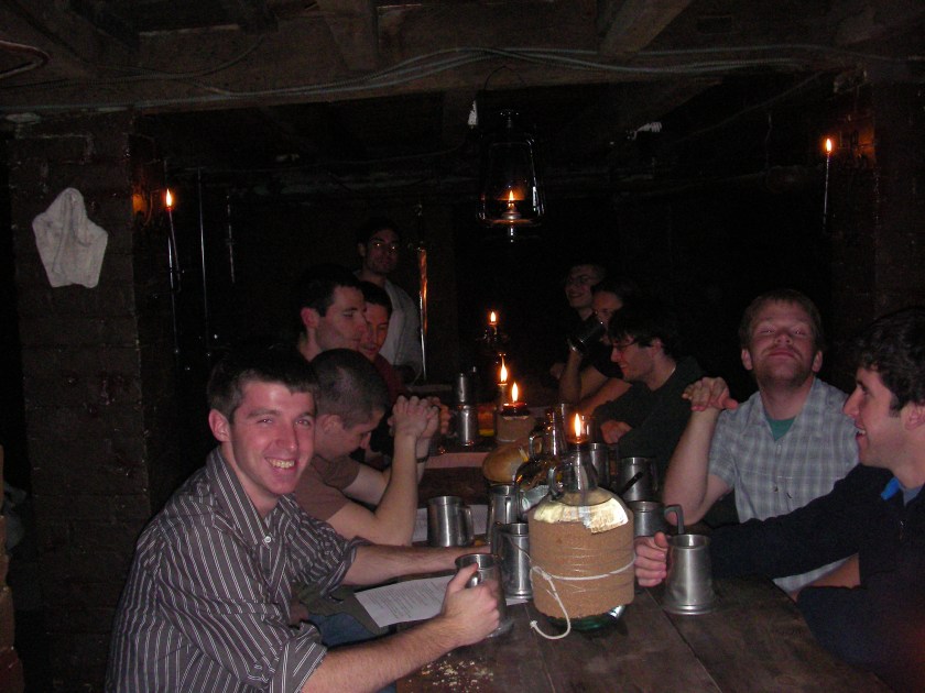 “Juntos” as we called them, in the basement of our apartment senior year of college. We would gather together some evenings to formally discuss philosophy, religion, politics, etc. while enjoying wine and bread. I don’t know what Dave (second in from the right) is doing.